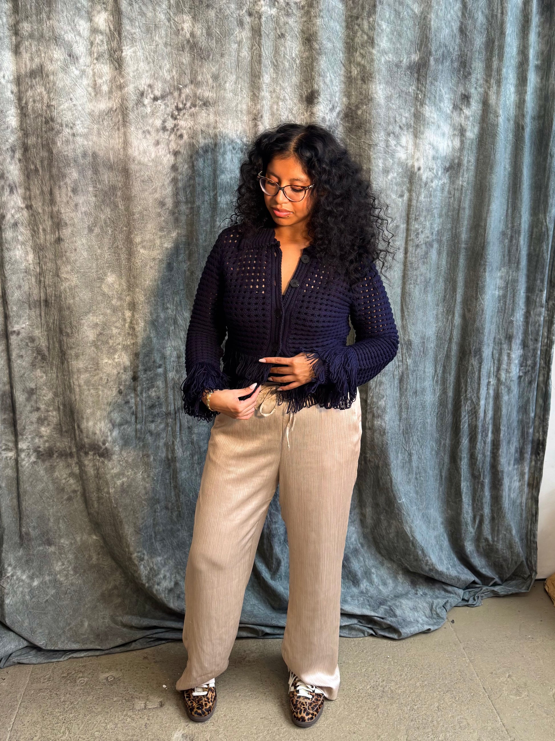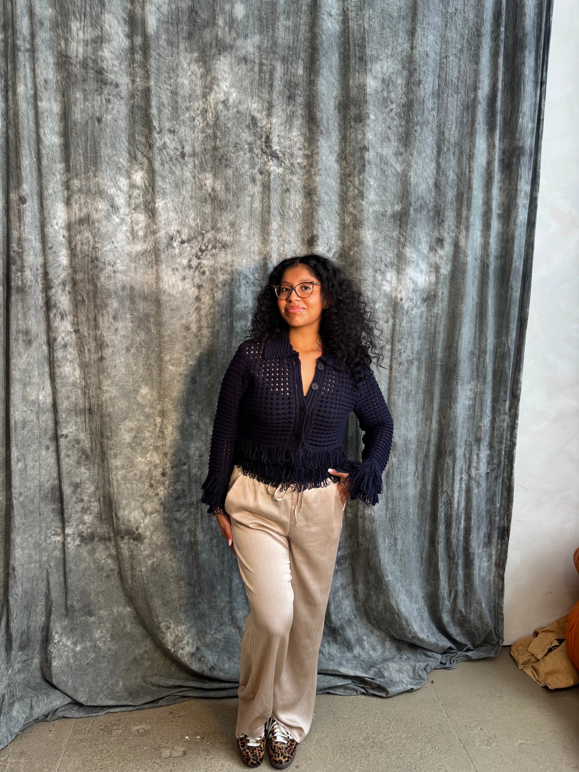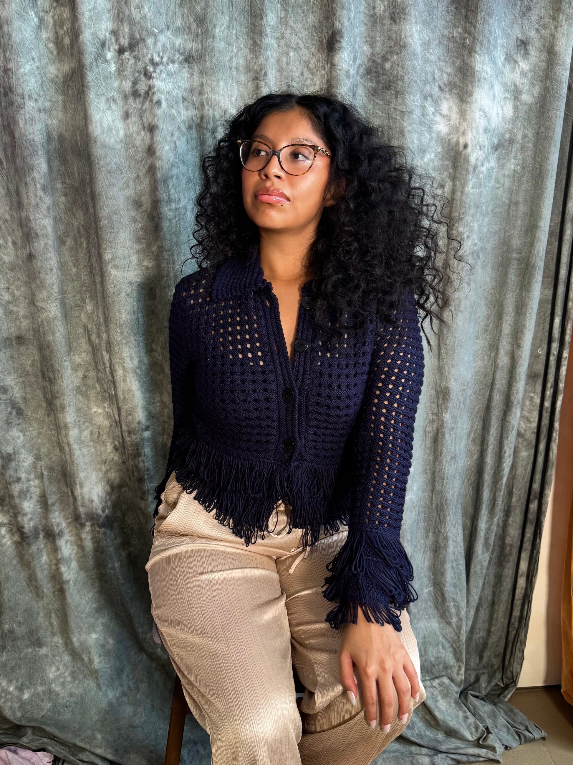 Bold, feminine, polished open knit piece celebrating a woman’s strength and sophistication.