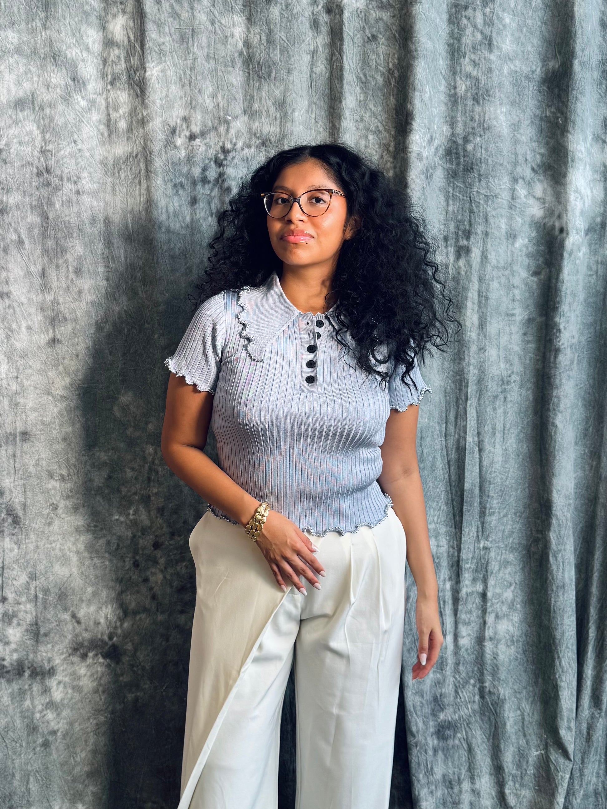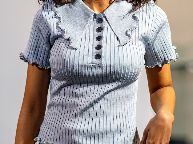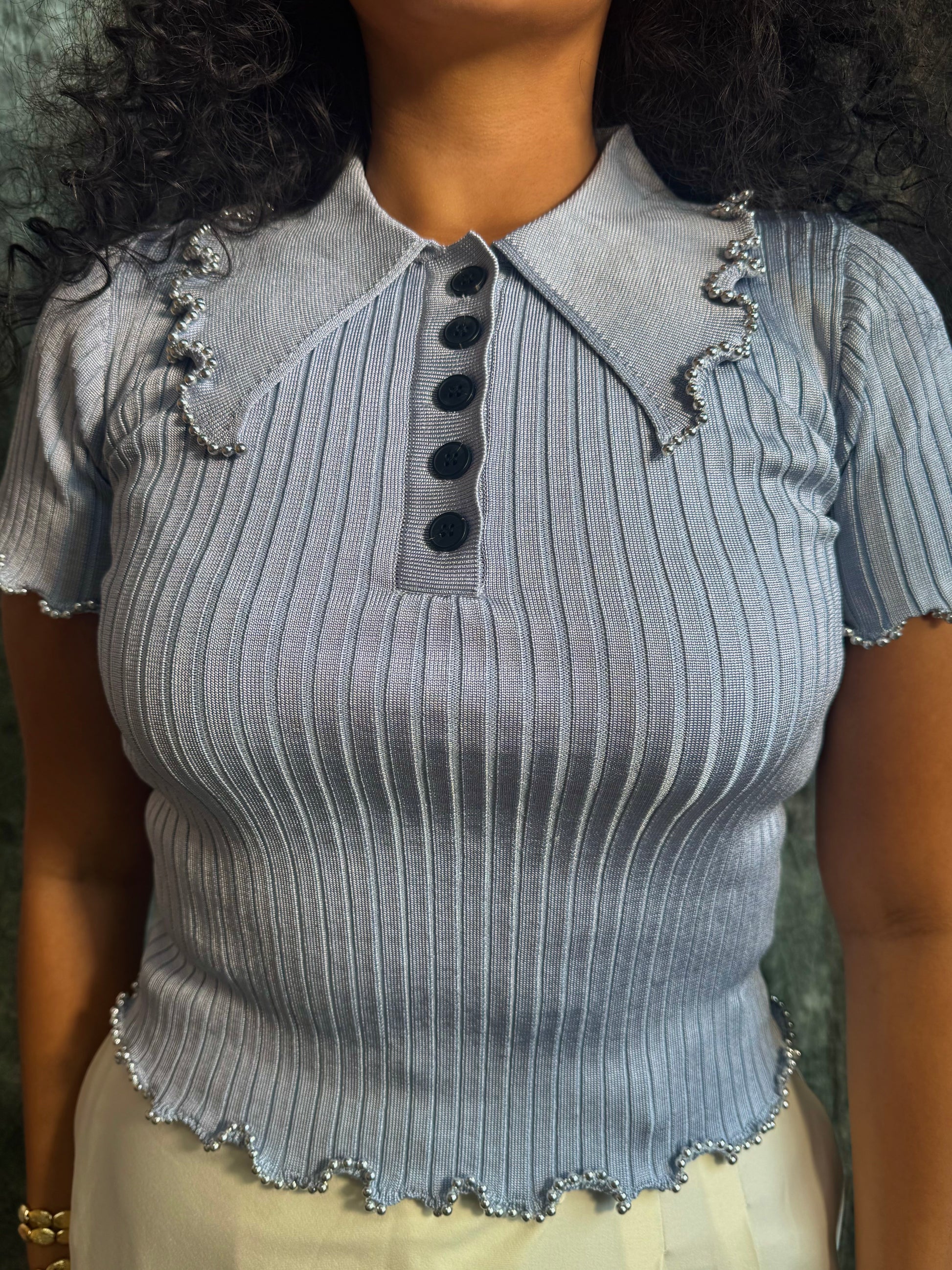 High Quality Knit Blouse with ruffle beaded trip and button up collar.